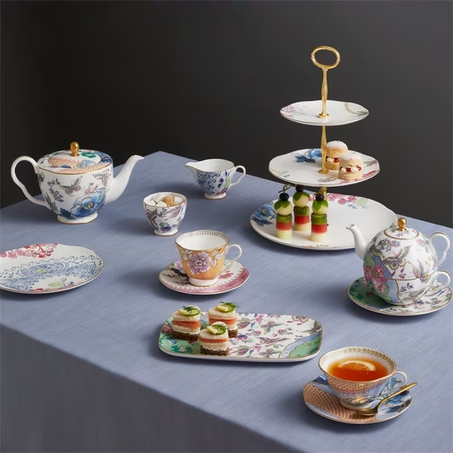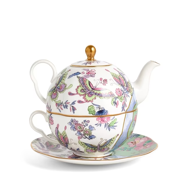 Enjoy a tranquil moment alone with this ingenious tea set for one. It combines a teapot, teacup and saucer, which fit neatly together in a single set. The fine bone china is decorated with elegant pastel-coloured butterflies fluttering amidst bold-hued botanicals. Wedgwood's signature gold banding on the rim and handles adds a luxurious finishing touch to this striking trio.