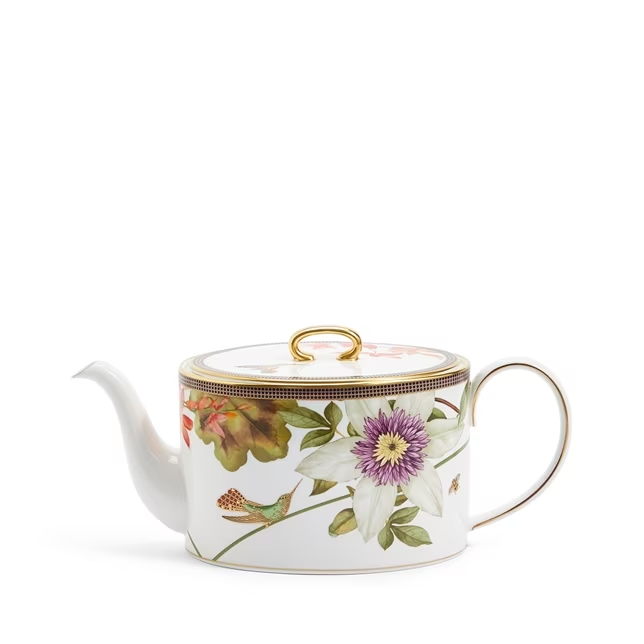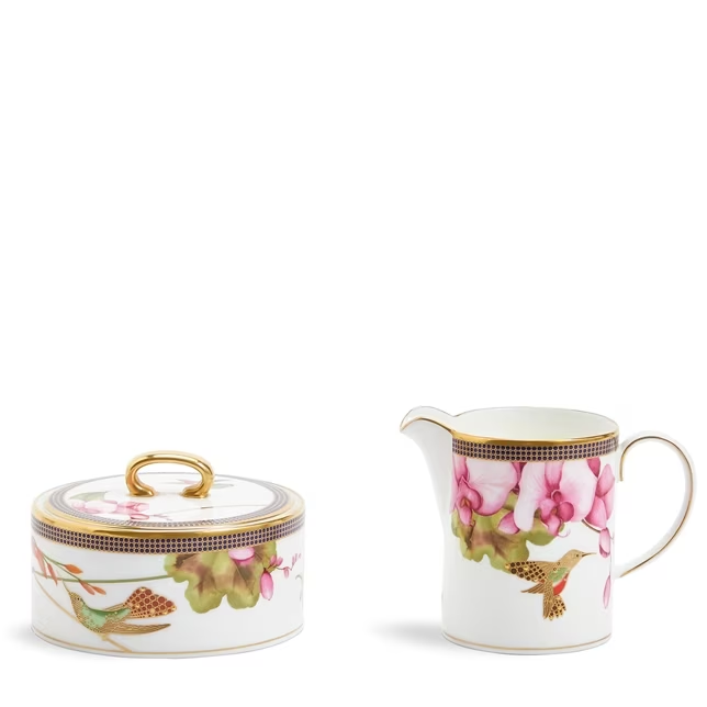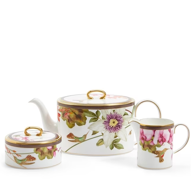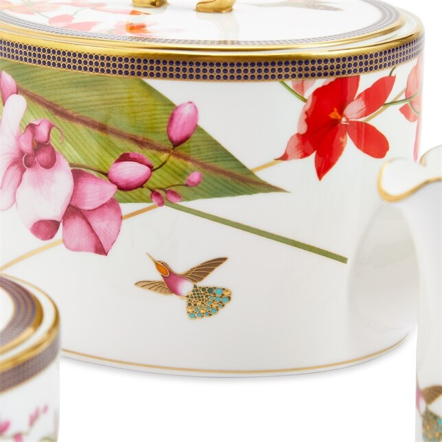 The Hummingbird 3-Piece Set is comprised of a striking teapot and elegant sugar and cream pieces that would make a beautiful gift for a collector or for your own home. Featuring hummingbirds and bold flowers in the most vivid of colours and finished with a 22 carat gold hand-applied accent to the outer edges…this three-piece set is truly a work of art. Presented in a Wedgwood Prestige gift box