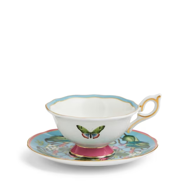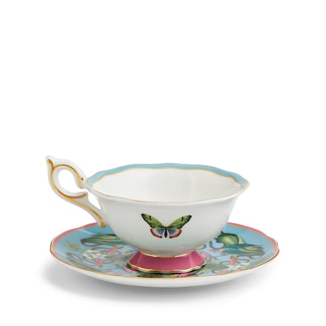 Inspired by fashion trends of animal prints and maximalist interior design, add the Wonderlust Menagerie Teacup & Saucer to your collection. Coming in a pink and blue colourway with gold banding, fine bone china features this unusual and eclectic assortment of flora and fauna to both the outside and inside of this beautiful cup and saucer. Almost too good to drink from, it’s the perfect gift for yourself or a travel-lover. Comes in our signature Wedgwood blue gift box.